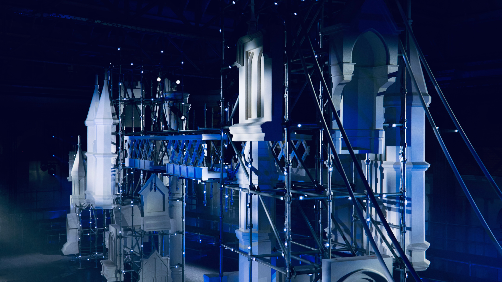 With our design, fabrication and engineering processes delivered to programme, structures were installed within Old Billingsgate’s 740sqm Grand Hall. High-density architectural elements were integrated within the scaffold Tower Bridge silhouette, with black flooring (including ‘puddles’) and bleacher seating surrounding the showpiece structure for nearly 600 guests.