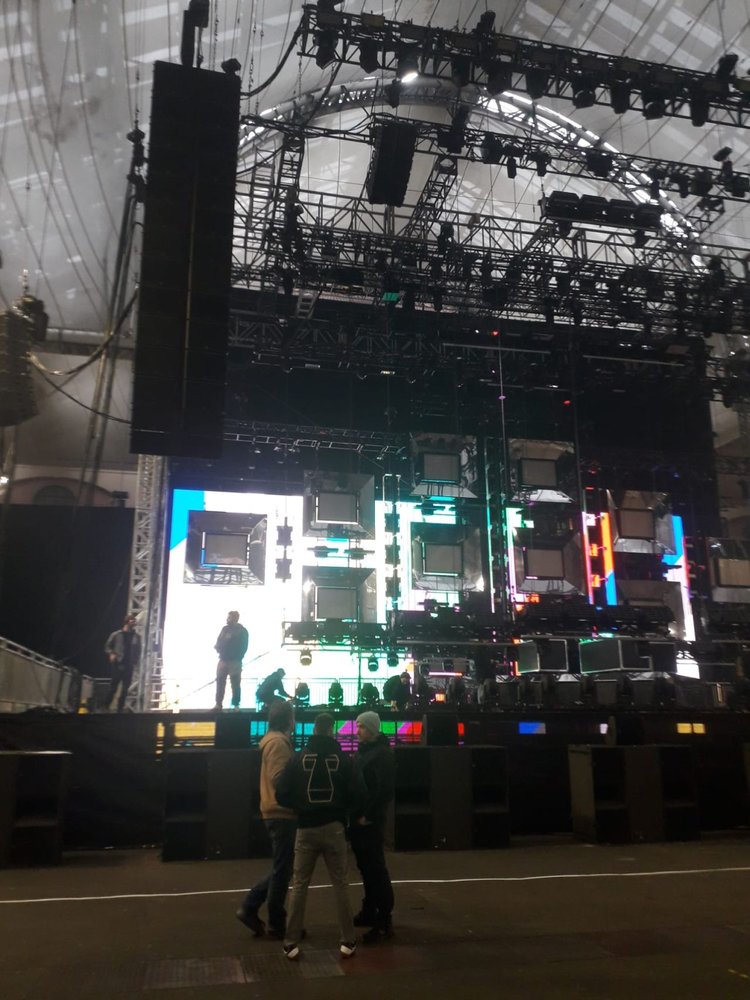 We worked with the technical team at Alexandra Palace and the house rigging company, Outback Rigging Ltd, to design a six-mast supported mega truss grid. The system let us optimise the trim height and rigging capacity at the venue, allowing effective load distribution across the house superstructure and the VerTech ground support.